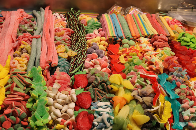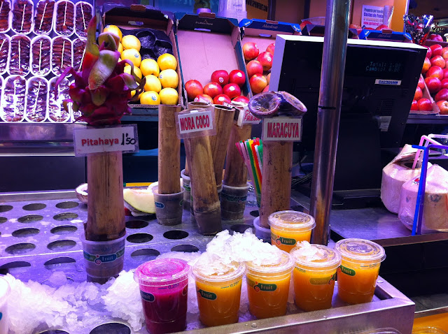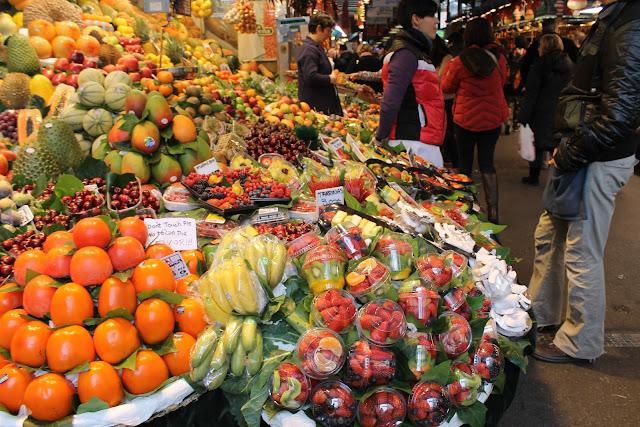 Depois de deixarmos as malas no hotel e descansarmos uns minutinhos, começámos a visita pela cidade. Como estava já ali ao lado, começámos pelas Ramblas e o fantástico Mercat de la Boqueria, onde vimos bancas com produtos expostos de uma forma fantástica!