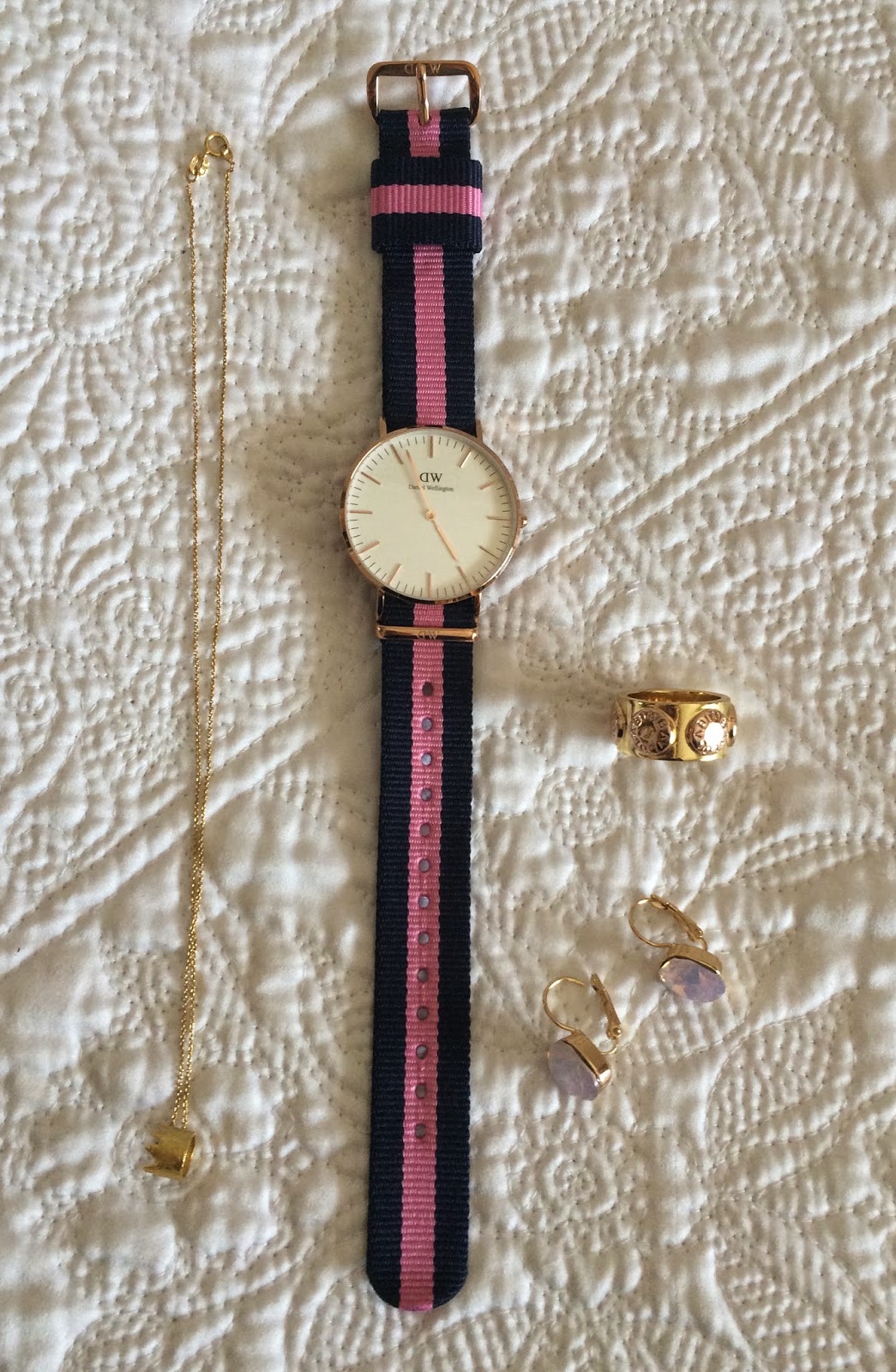 Estes são os novos acessórios que têm andado comigo quase todos os dias. O colar é da Our Sins, acho-o super feminino. O relógio é Daniel Wellington simples mas sofisticado e se usarem o código “amiudadossaltosaltos” têm 15% de desconto em qualquer produto da marca. O anel é da Bimba y Lola e foi um presente de anos e os brincos são da Pampa Mia, têm uma pedra com cor entre o lilás e o rosa, consoante a luz!